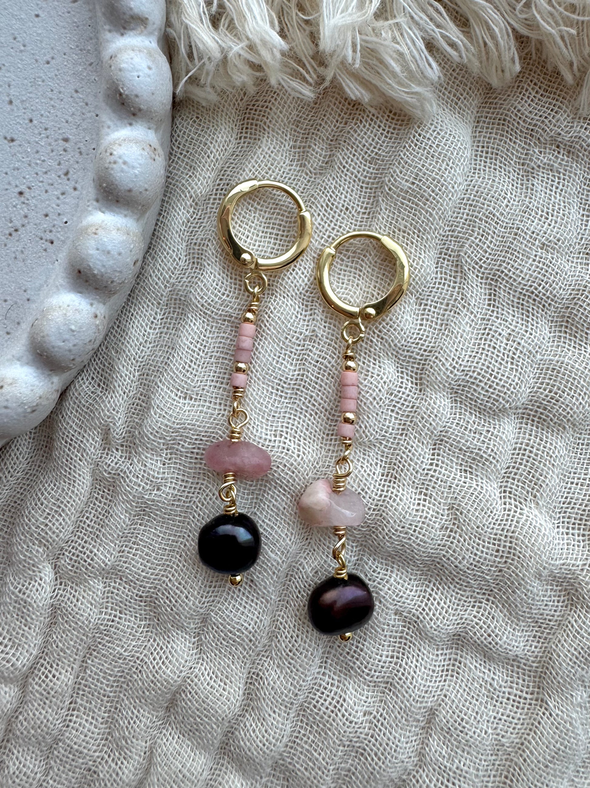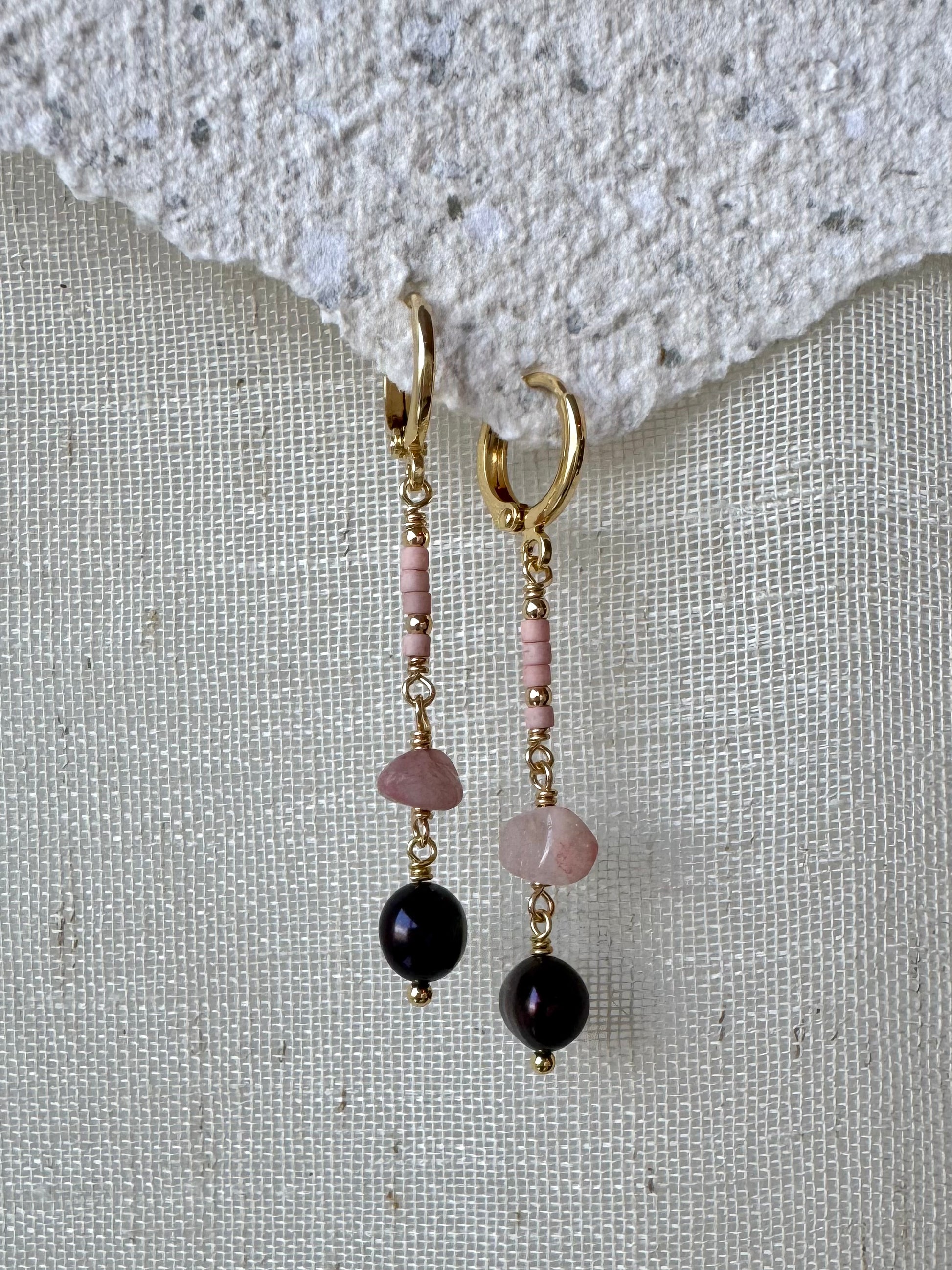 14k gullhúðaðir lokkar með endurnýttum perlum, rose quartz steinum og glerperlum