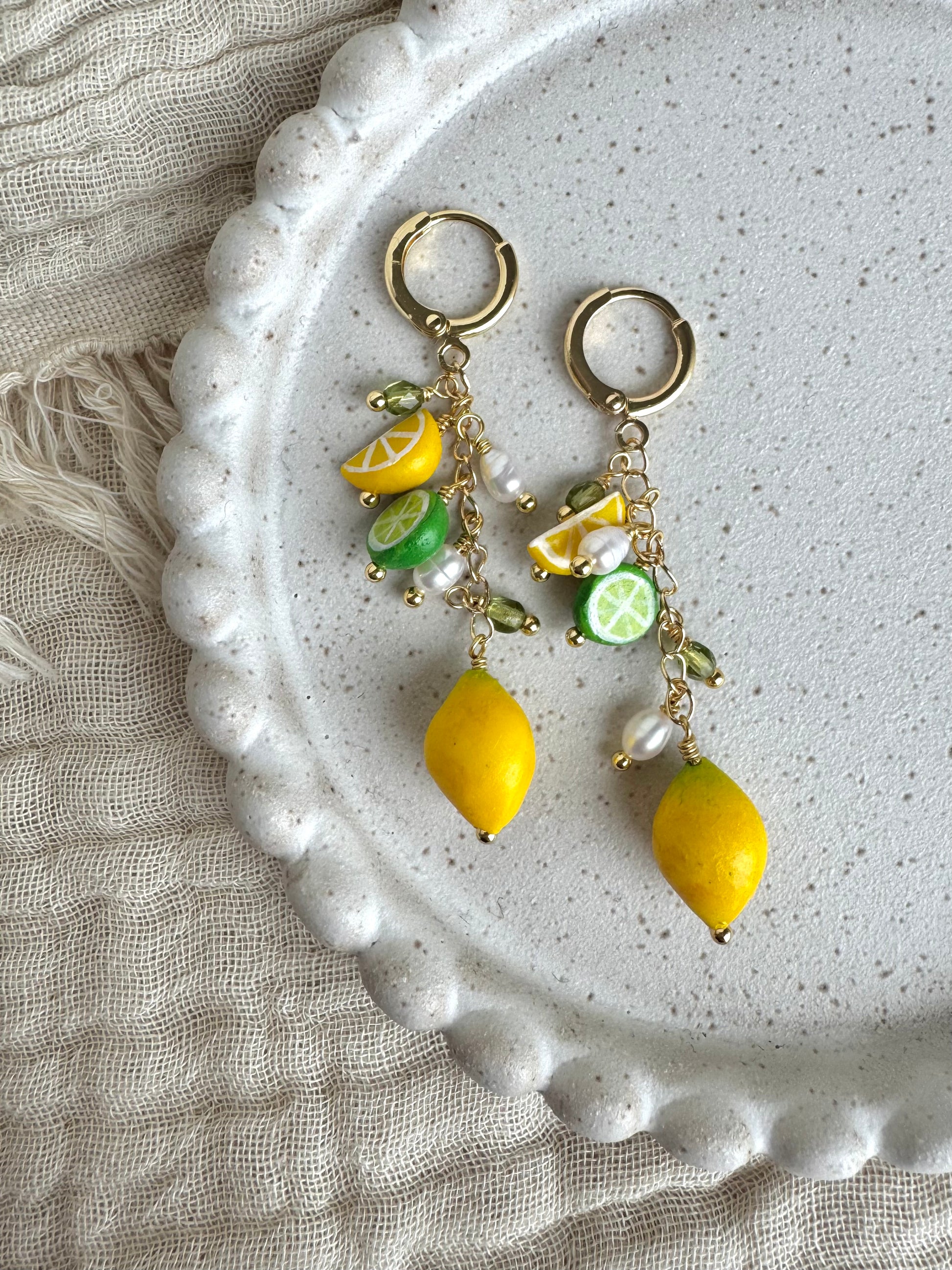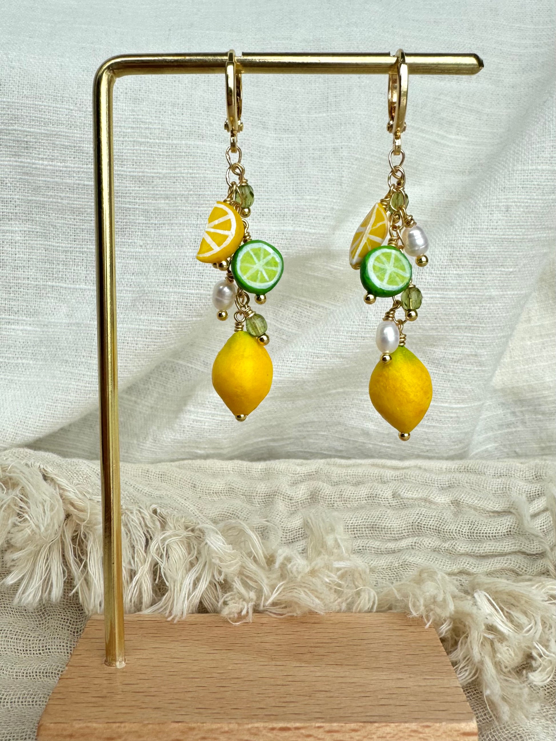 14k gullhúðaðir eyrnalokkar með polymer sítrónum, ferskvatnsperlum og tékkneskum glerperlum